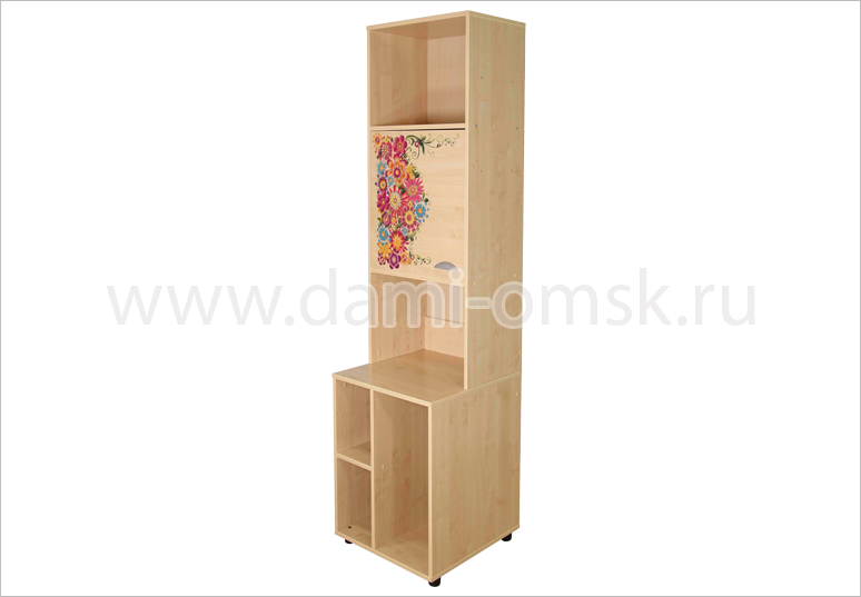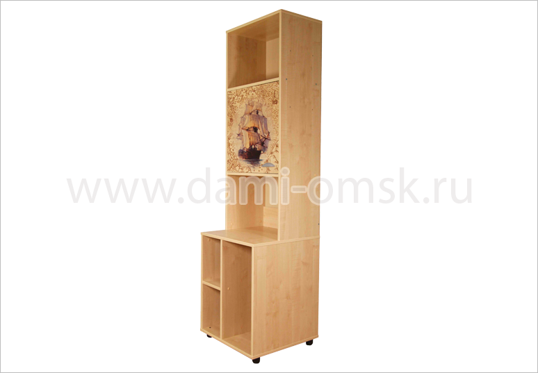 Стеллаж является частью стенки Дэми, но может использоваться и отдельно. Нижняя часть представляет из себя тумбу под системный блок, без задней стенки, для того чтобы можно было вывести провода. Верхняя – полки с дверкой.